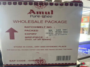 અમદાવાદના ખોખરા વિસ્તારમાં મ્યુનિસિપલ કોર્પોરેશનના ફૂડ વિભાગ દ્વારા નકલી ઘી વેચાણના શંકાસ્પદ જથ્થાને ઝડપી પાડવામાં આવ્યો છે. શહેરના જશોદાનગર વિસ્તારમાં ચારભુજા કિરાણા સ્ટોરમાંથી 15 કિલોના 7 ડબ્બા (કુલ 105 કિલો) શંકાસ્પદ અમૂલ ઘી જપ્ત કરવામાં આવ્યું. આ ડબ્બાઓ પર હિન્દીમાં “શુદ્ધ” શબ્દની જગ્યાએ “શદ્ધ” લખેલું જોવા મળ્યું, જેનાથી તેના નકલી હોવાની શંકા ઉઠી.