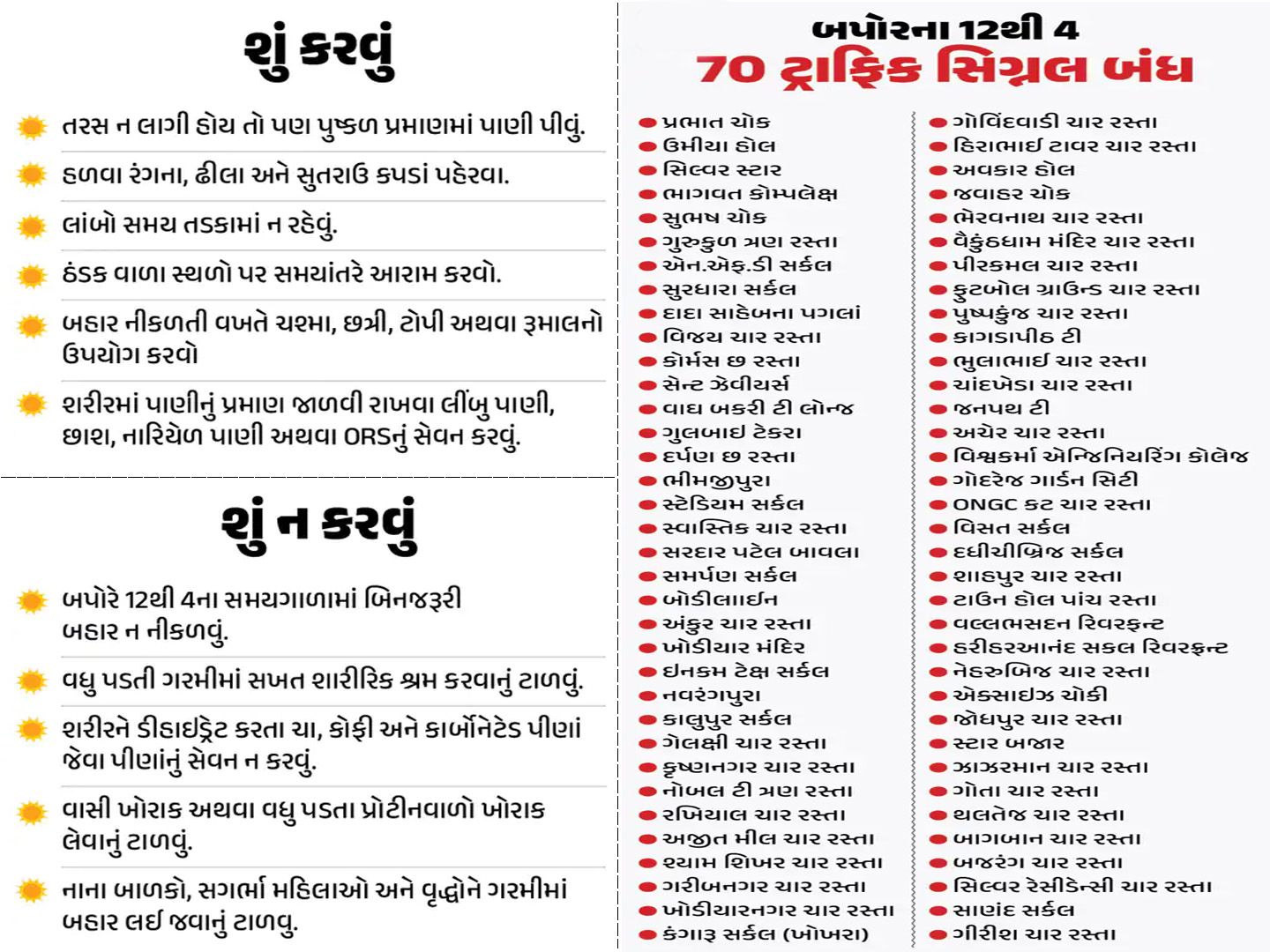 ગરમીના સૌથી કઠોર સમયમાં એટલે કે બપોરે 12 વાગ્યાથી 4 વાગ્યા સુધી લોકોને ટ્રાફિક સિગ્નલ પર લાંબા સમય સુધી ઉભા રહેવું ન પડે તે માટે શહેરના 70 જેટલા ટ્રાફિક સિગ્નલો આ સમયગાળા દરમિયાન બંધ રાખવાનો નિર્ણય લેવામાં આવ્યો છે. આ પગલાંથી ટ્રાફિકમાં ઉભેલા લોકો, વાહનચાલકો તેમજ પદયાત્રીઓને તડકામાં ઉભા રહેવાની પરિસ્થિતિમાંથી થોડુંક રાહત મળશે.