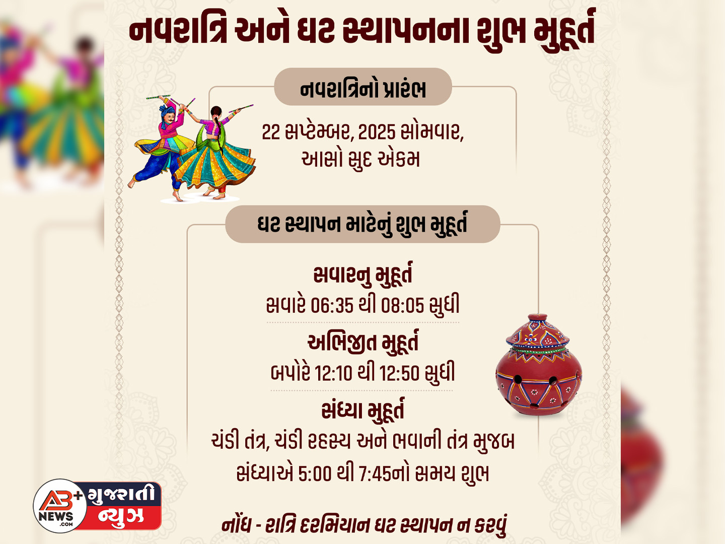 જ્યોતિષાચાર્યએ મત્સ્ય પુરાણનો ઉલ્લેખ કરતાં જણાવ્યું છે કે, રાત્રિ દરમિયાન ઘટ સ્થાપન ન કરવું જોઈએ.