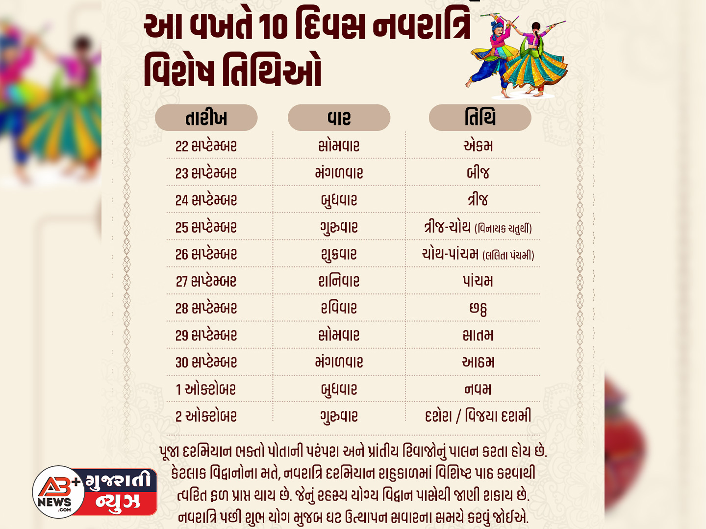 નવરાત્રિ 2025 : આ વર્ષે શક્તિની આરાધનાનો પાવન પર્વ નવરાત્રિ 22 સપ્ટેમ્બર, સોમવારથી શરૂ થઈ રહ્યો છે. નવ દિવસ સુધી ચાલનારો આ ઉત્સવ 01 ઓક્ટોબર, બુધવારે સમાપ્ત થશે. આ દરમિયાન ઘટ સ્થાપન અને વિજયા દશમીના શુભ મુહૂર્ત વિશે જ્યોતિષાચાર્ય દ્વારા માહિતી આપવામાં આવી છે.