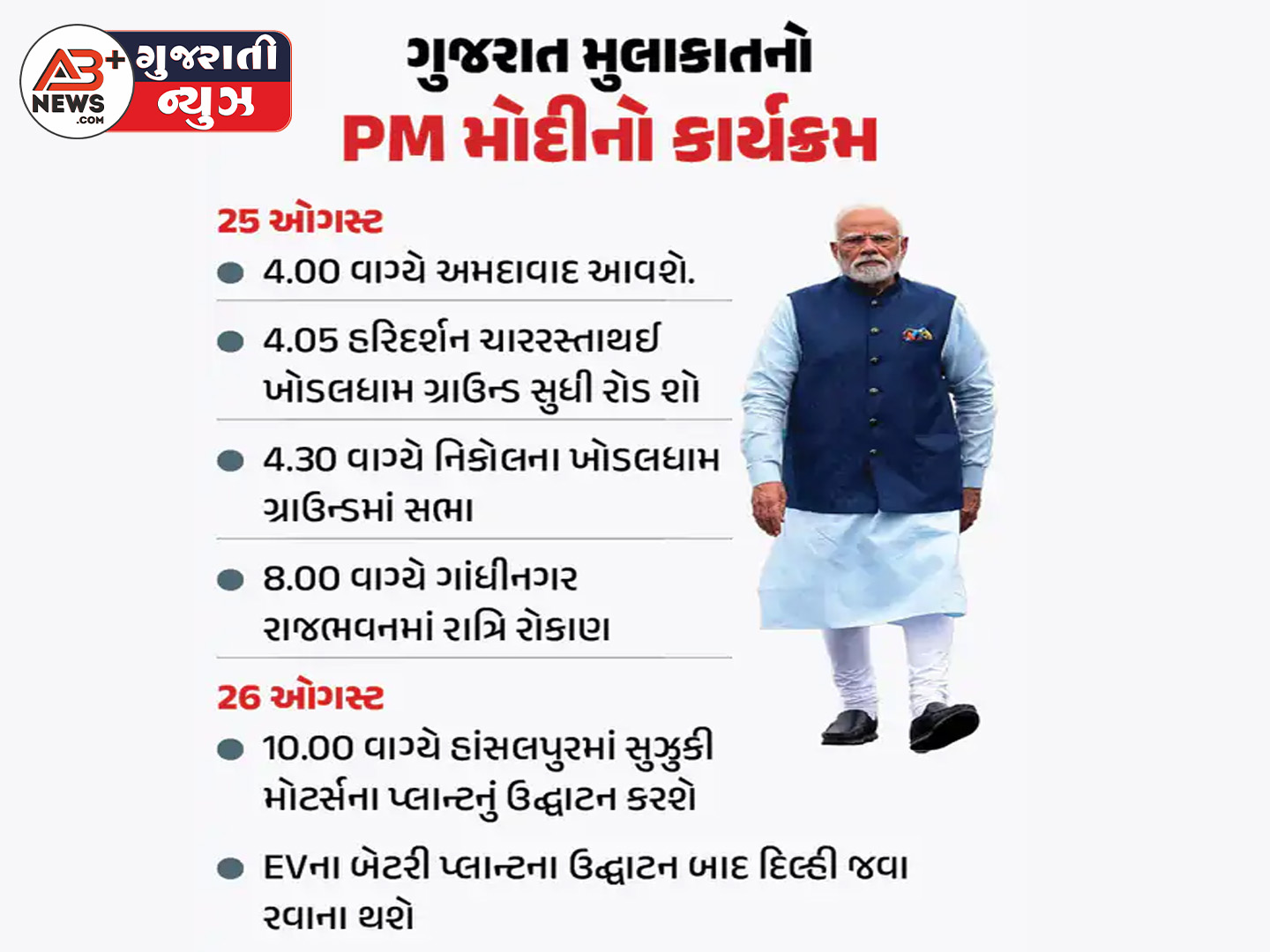 PM નરેન્દ્ર મોદી 25 અને 26 ઓગસ્ટે બે દિવસીય ગુજરાત પ્રવાસે આવી રહ્યા છે. આ પ્રવાસ દરમિયાન અમદાવાદ, શેલા, મણિપુર, ગોધાવી, સનાથલ, તેલાવ સહિત અનેક વિસ્તારોમાં કરોડો રૂપિયાના વિકાસકાર્યોનું લોકાર્પણ અને ખાતમુહૂર્ત થશે. ખાસ કરીને અમદાવાદ શહેરના નિકોલ વિસ્તારમાં વડાપ્રધાનની જાહેરસભા અને રોડ શો અંગે ભારે ઉત્સાહ જોવા મળી રહ્યો છે.