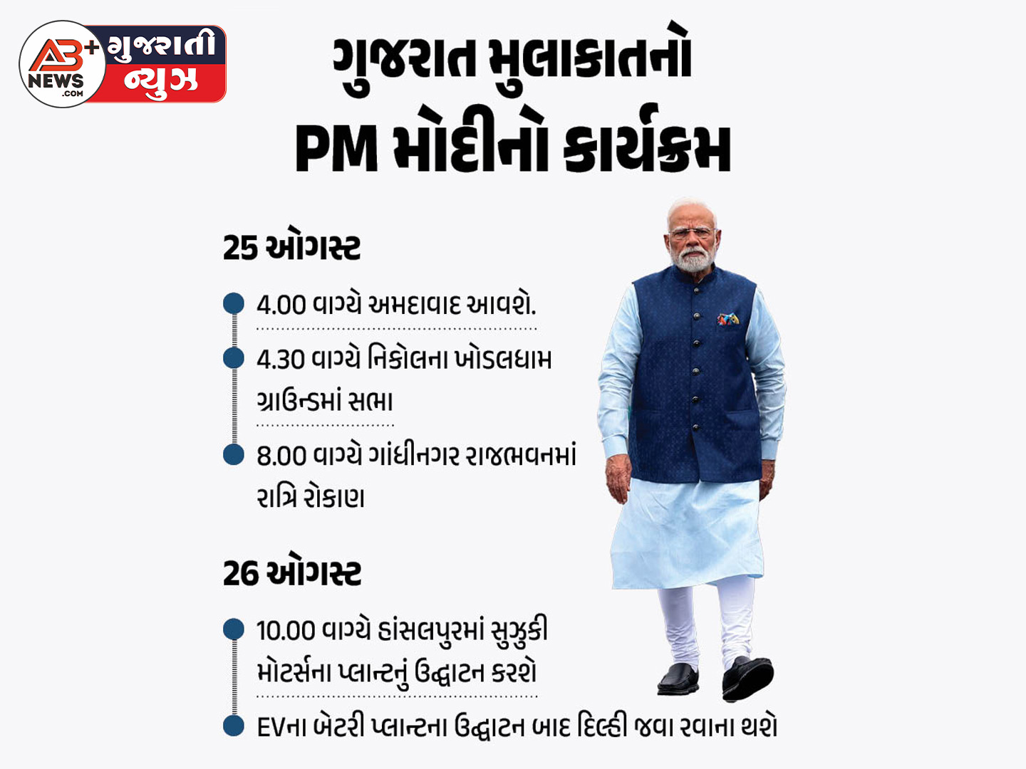 અમદાવાદ, તા. 22 ઑગસ્ટ – PM મોદી 25 અને 26 ઑગસ્ટે ગુજરાતની મુલાકાતે આવી રહ્યા છે. આ અવસર પર અમદાવાદના નિકોલ ખાતે ખોડલધામ ગ્રાઉન્ડમાં તેઓ સાંજે 4:30 વાગ્યે ₹5,477 કરોડના વિકાસ કાર્યોનું લોકાર્પણ અને ખાતમુહૂર્ત કરશે. કુલ 22 જેટલા પ્રોજેક્ટોનો સમાવેશ થનારા આ કાર્યક્રમમાં અમદાવાદ, મહેસાણા અને ગાંધીનગરના રેલવે, અર્બન ડેવલપમેન્ટ, રોડ એન્ડ બિલ્ડિંગ તથા રેવન્યુ વિભાગો સંકળાયેલા છે. સાથોસાથ વડાપ્રધાન સાબરમતીથી કટોસણ રોડ ટ્રેન અને કાર લોડેડ ટ્રેનને લીલી ઝંડી આપશે.