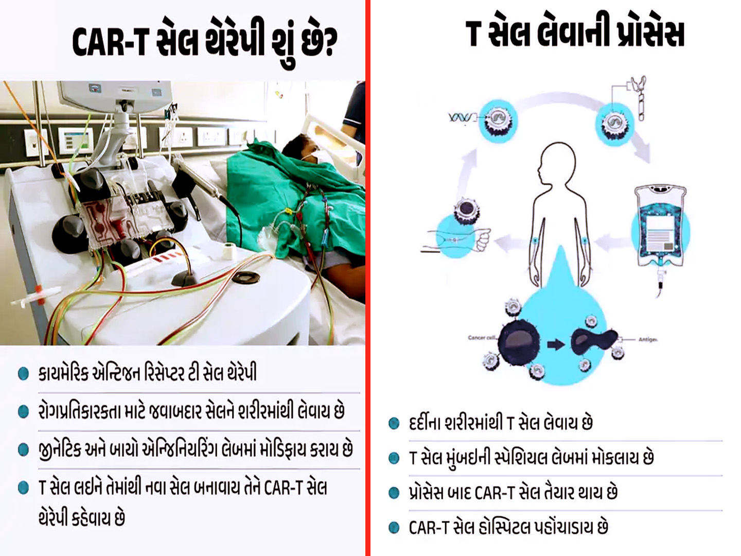 CAR-T થેરેપી માટે સૌથી પહેલાં દર્દીના શરીરમાંથી લોહી લેવામાં આવે છે અને તેમાંના T સેલ અલગ કરવામાં આવે છે. આ સેલ્સ મુંબઇની સ્પેશિયલ લેબમાં મોકલવામાં આવે છે જ્યાં 2થી 3 અઠવાડિયામાં તેમને સુધારવામાં આવે છે. લેબમાં ક્વોલિટી કન્ટ્રોલ બાદ તૈયાર થયેલા CAR-Tસેલ માઇનસ 80 ડિગ્રી તાપમાને અમદાવાદ મોકલવામાં આવે છે. ત્યારબાદ હોસ્પિટલમાં દર્દીને એ સેલ આપવામાં આવે છે — આ પ્રક્રિયા દરમિયાન કોઇ સર્જરી કરવાની જરૂર પડતી નથી.